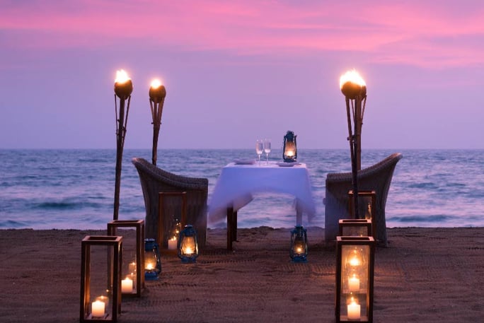 Romantic dining for two with options including a torch-lit oceanfront table or a treehouse overlooking the river.