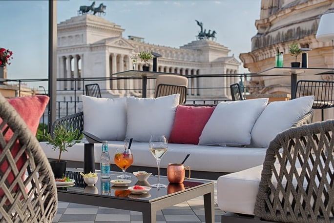 Enjoy a fantastic view of the historic Roman Forum and the city's skyline from our elegant rooftop bar. A more romantic and luxurious rooftop in Rome is difficult to find. Indulge in breathtaking views of the Eternal City paired with a unique aperitif and a complimentary box of chocolates crafted exceptionally for our valued members.