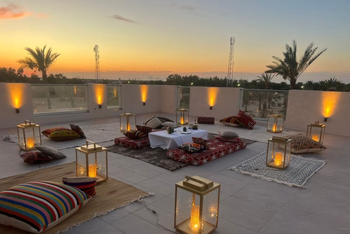 Enjoy a Berber dinner under the stars. Make a special occasion truly unforgettable with a magical dining experience, personally tailored just for you. Dine in a private, luxurious desert tent set for two, beneath the starlit sky.